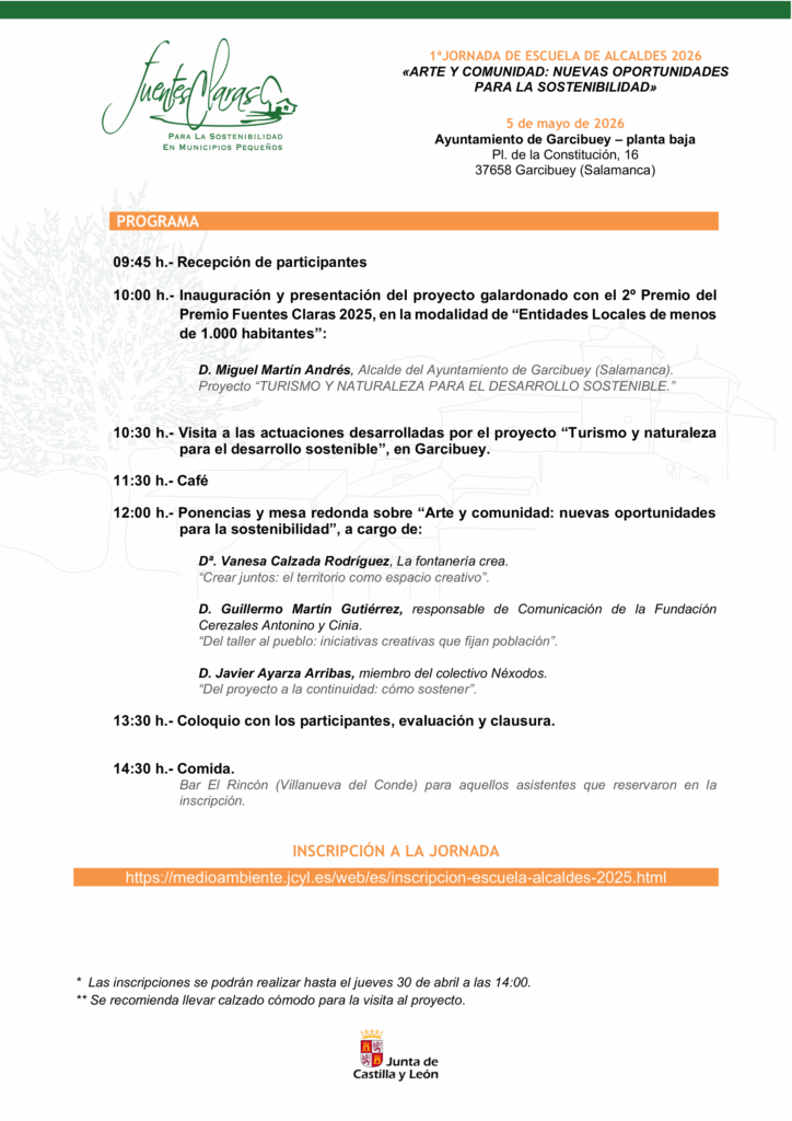 La localidad de Garcibuey acoge el próximo 5 de mayo de 2026 la 1ª Jornada de la Escuela de Alcaldes bajo el título “Arte y comunidad: nuevas oportunidades para la sostenibilidad”, un encuentro que reunirá a responsables locales, expertos y participantes para reflexionar sobre el papel de la creatividad en el desarrollo rural. La jornada incluye la presentación de un proyecto premiado de turismo sostenible, una visita a iniciativas locales, ponencias y mesa redonda con profesionales del ámbito cultural y social, además de un coloquio final, convirtiéndose en una cita clave para compartir ideas y experiencias en torno a la innovación y el futuro de los pequeños municipios.