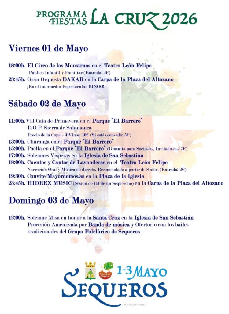 La localidad de Sequeros se prepara para vivir uno de los fines de semana más especiales del año con la celebración de sus fiestas de la Santa Cruz, que tendrán lugar del 1 al 3 de mayo de 2026. Un programa completo que combina tradición, cultura, gastronomía y música en un entorno único dentro de la Sierra de Francia.